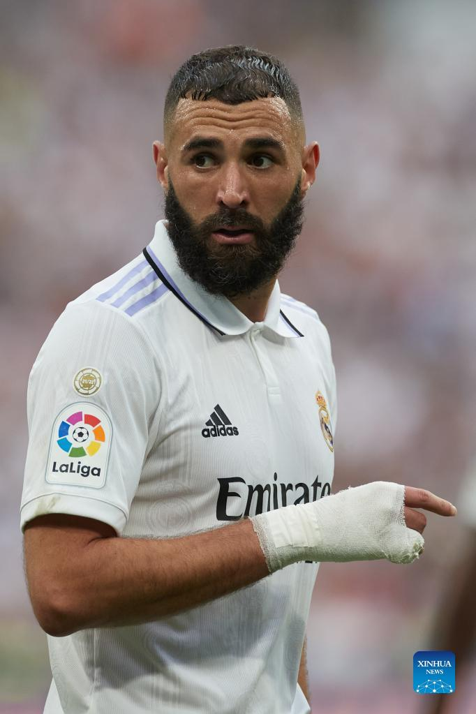 Karim Benzema of Real Madrid reacts during a La Liga football match between Real Madrid and FC Barcelona in Santiago Bernabeu Stadium, Madrid, Spain, Oct. 16, 2022. (Xinhua/Meng Dingbo)