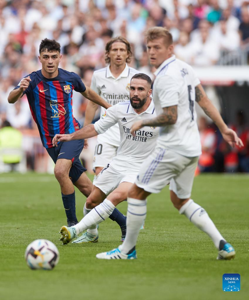 Pedri (L) of Barcelona passes the ball during a La Liga football match between Real Madrid and FC Barcelona in Santiago Bernabeu Stadium, Madrid, Spain, Oct. 16, 2022. (Xinhua/Meng Dingbo)