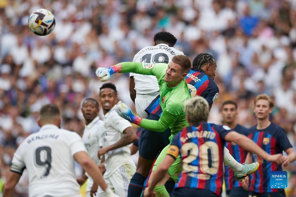 Marc-Andre ter Stegen (C) of Barcelona saves the ball during a La Liga football match between Real Madrid and FC Barcelona in Santiago Bernabeu Stadium, Madrid, Spain, Oct. 16, 2022. (Xinhua/Meng Dingbo)