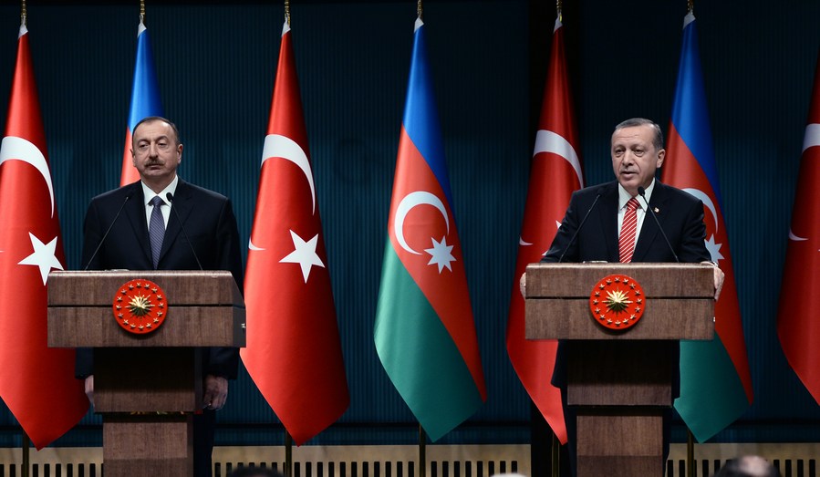 Turkish President Recep Tayyip Erdogan (R) attends the joint press conference with visiting Azerbaijan President Ilham Aliyev at the Presidential Palace in Ankara, capital of Turkey, on March 15, 2016. (Xinhua File photo)