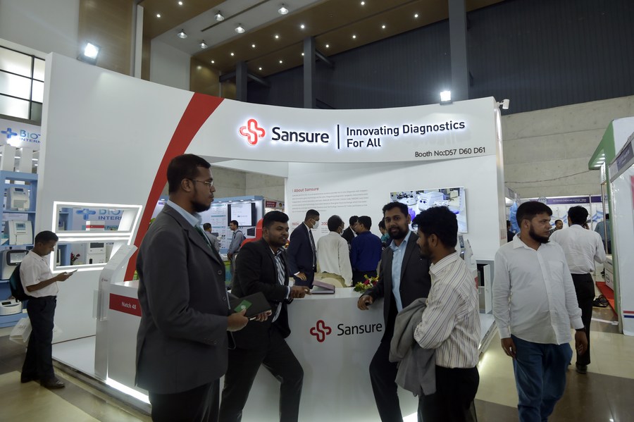 Visitors talk in front of an exhibition booth of Sansure Biotech Inc. during the "Meditex Bangladesh 2022" expo in Dhaka, Bangladesh, on Oct. 13, 2022. (Xinhua)