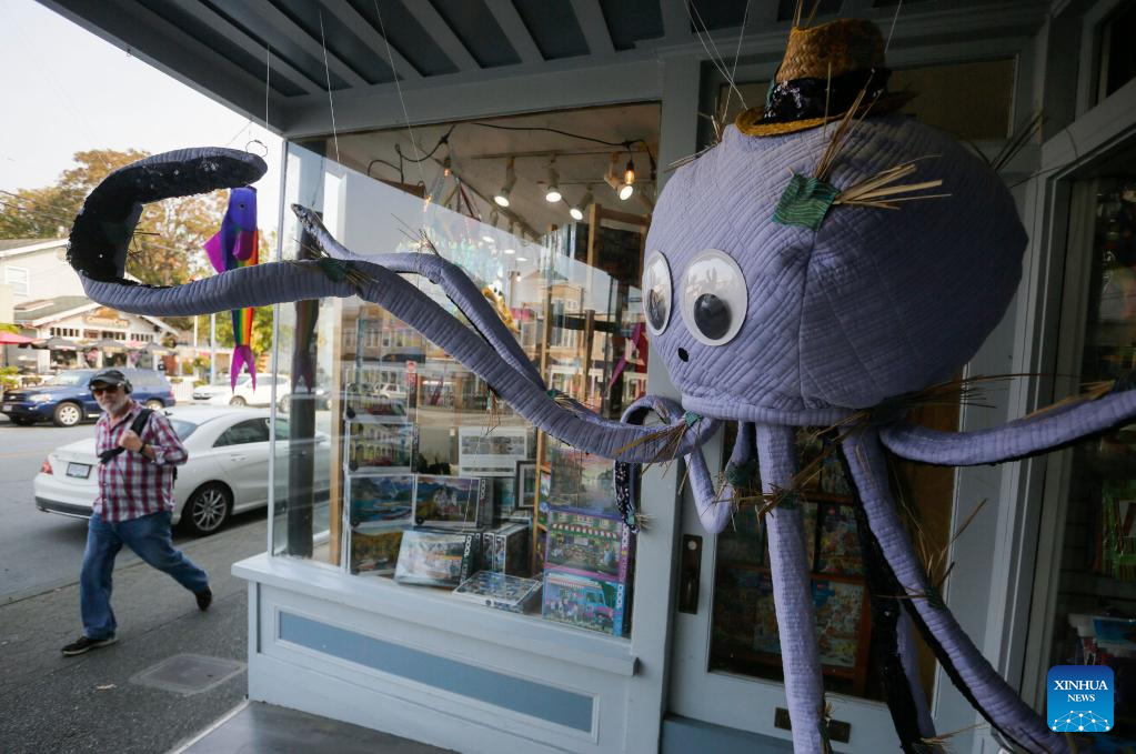 A Halloween-themed installation is displayed outside a store in Vancouver, British Columbia, Canada, on Oct. 17, 2022. (Photo by Liang Sen/Xinhua)