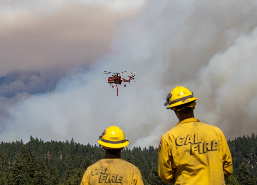 A helicopter flies to fight a wildfire dubbed Dixie Fire in Lassen National Forest, Northern California, the United States, on Aug. 5, 2021. (Photo by Dong Xudong/Xinhua)