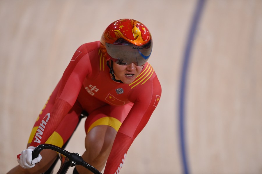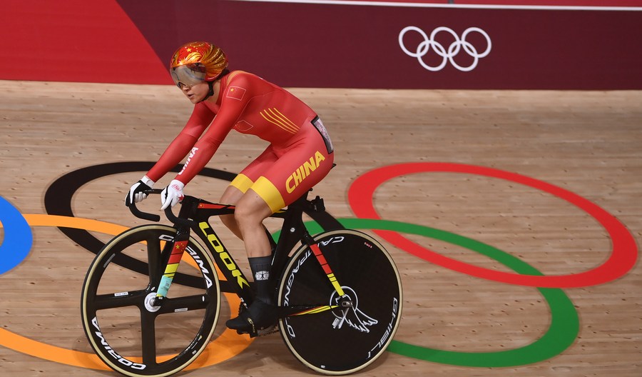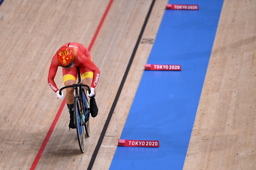 Zhong Tianshi in action during the women's team sprint final at Tokyo 2020 Olympic Games, in Izu, Japan, Aug. 2, 2021. (Xinhua/Zhang Hongxiang)