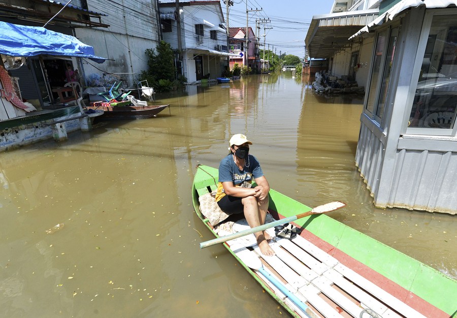 A woman sits on a boat on a flooded street in Ayutthaya, Thailand, on Oct. 18, 2022. (Xinhua/Rachen Sageamsak)