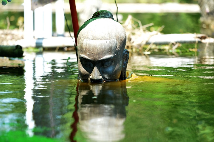 Photo taken on Oct. 18, 2022 shows a sculpture in a flooded area in Ayutthaya, Thailand. (Xinhua/Rachen Sageamsak)