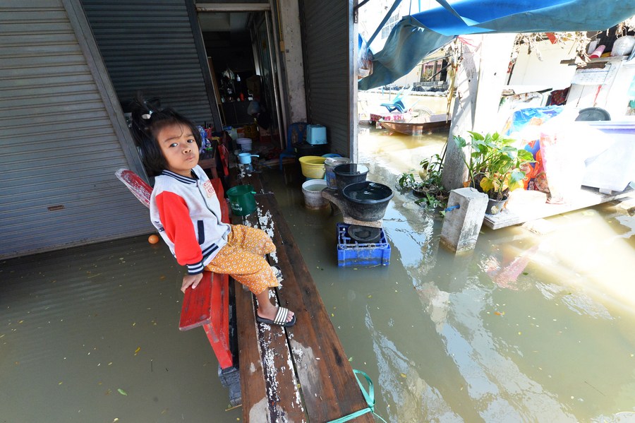 A girl sits over the floodwater outside a house in Ayutthaya, Thailand, on Oct. 18, 2022. (Xinhua/Rachen Sageamsak) ■