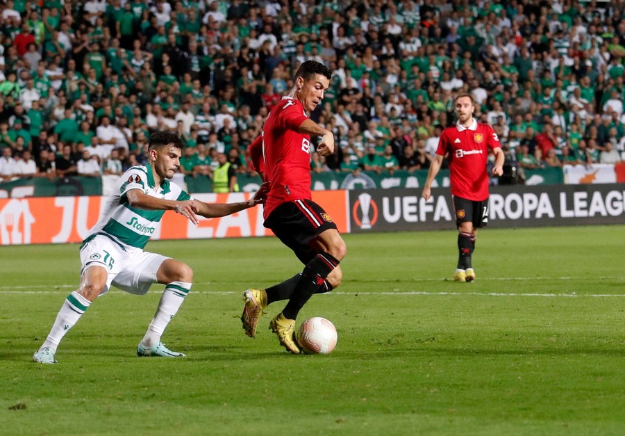 Cristiano Ronaldo (C) of Manchester United evades an Omonia Nicosia defender during their UEFA Europa League match in Nicosia, Cyprus on Oct. 6, 2022. (Photo by George Christophorou/Xinhua)