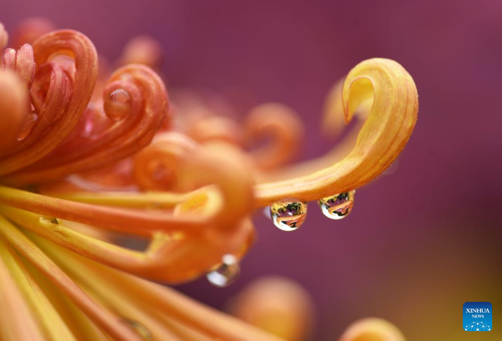 This photo taken on Oct. 17, 2022 shows rain drops hanging on a chrysanthemum in Lijiang City of southwest China's Yunnan Province. First Frost, also known as Shuangjiang, is one of the 24 solar terms of the Chinese lunar calendar and will fall on Oct. 23 this year. (Photo by Zhao Qingzu/Xinhua)