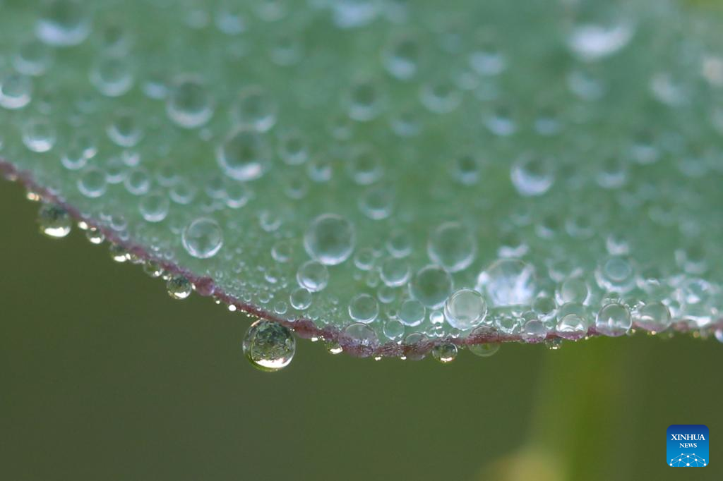 This photo taken on Oct. 18, 2022 shows morning dew on a plant in Yankou Town, Guang'an City of southwest China's Sichuan Province. First Frost, also known as Shuangjiang, is one of the 24 solar terms of the Chinese lunar calendar and will fall on Oct. 23 this year. (Photo by Xia Junlin/Xinhua)