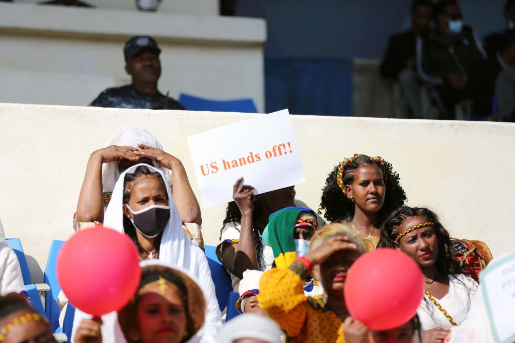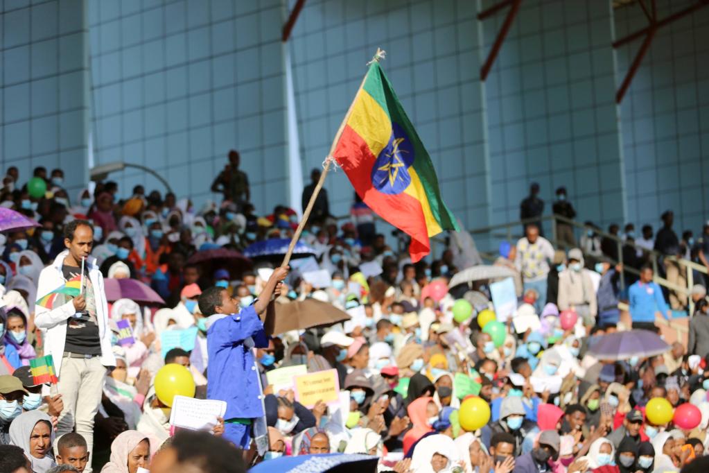 People participate in a rally to condemn the Tigray People's Liberation Front (TPLF) and Western intervention in the internal affairs of Ethiopia in Addis Ababa, Ethiopia, Dec. 5, 2021. (Xinhua/Wang Ping)