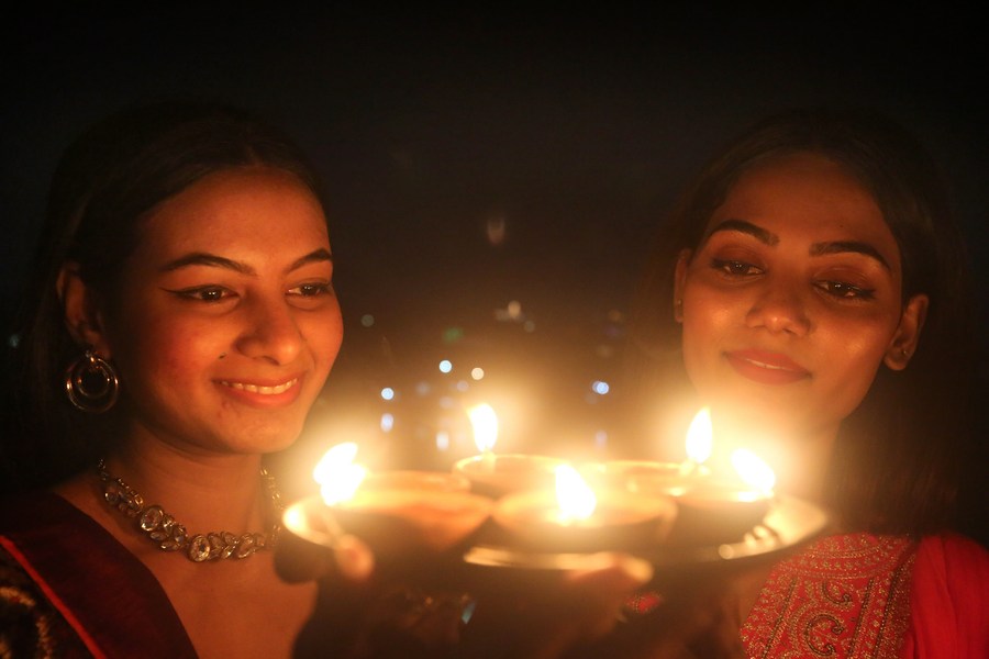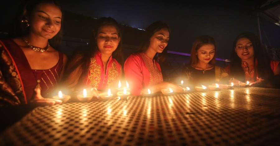 Women light lamps on the eve of Diwali, or the Festival of Lights, in Bhopal, India, Oct. 23, 2022. (Str/Xinhua)