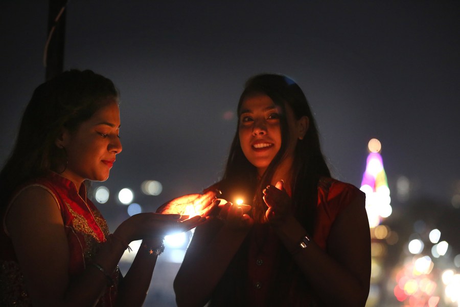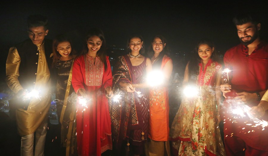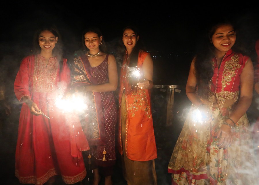 Women burn firecrackers on the eve of Diwali, or the Festival of Lights, in Bhopal, India, Oct. 23, 2022. (Str/Xinhua)