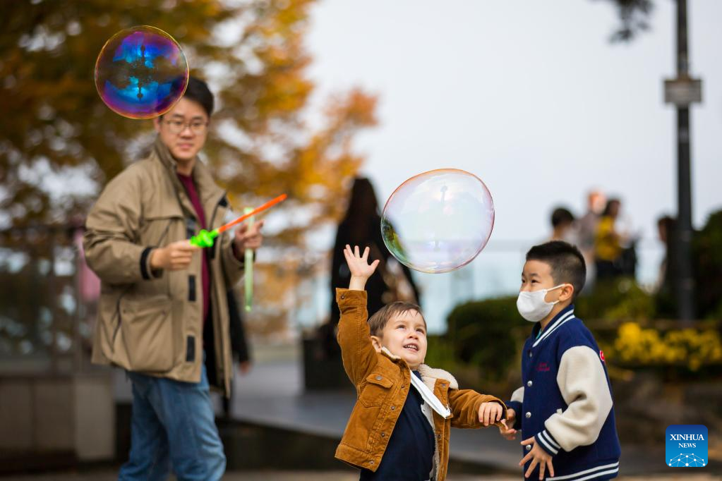 Children play with soap bubbles at Namsan Park in Seoul, South Korea, Oct. 23, 2022. (Xinhua/Wang Yiliang)