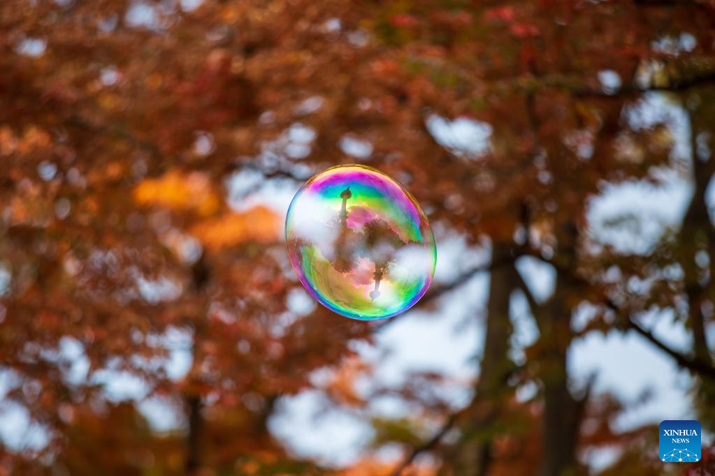 This photo taken on Oct. 23, 2022 shows a soap bubble reflecting the Namsan Seoul Tower at Namsan Park in Seoul, South Korea. (Xinhua/Wang Yiliang)