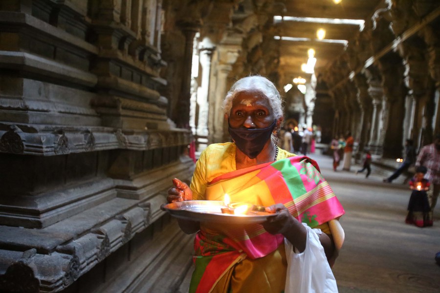 Hindu devotees celebrate Diwali, or the festival of lights, at a Hindu temple in Colombo, Sri Lanka, Oct. 24, 2022. (Photo by Ajith Perera/Xinhua)