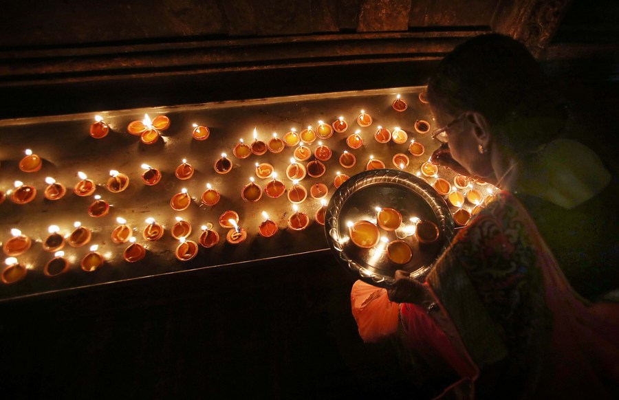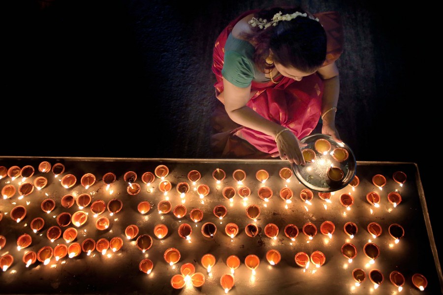 A Hindu devotee lays oil lamps to celebrate Diwali, or the festival of lights, at a Hindu temple in Colombo, Sri Lanka, Oct. 24, 2022. (Photo by Ajith Perera/Xinhua)
