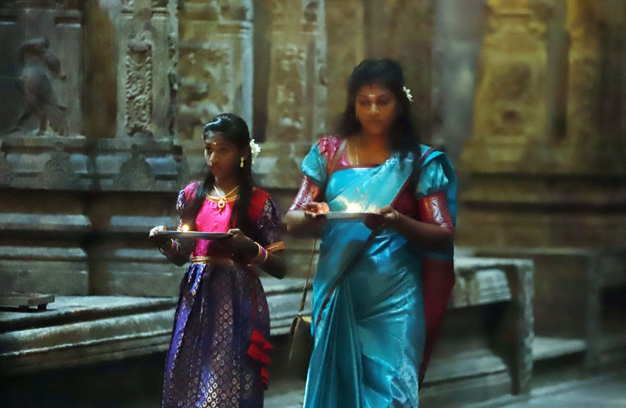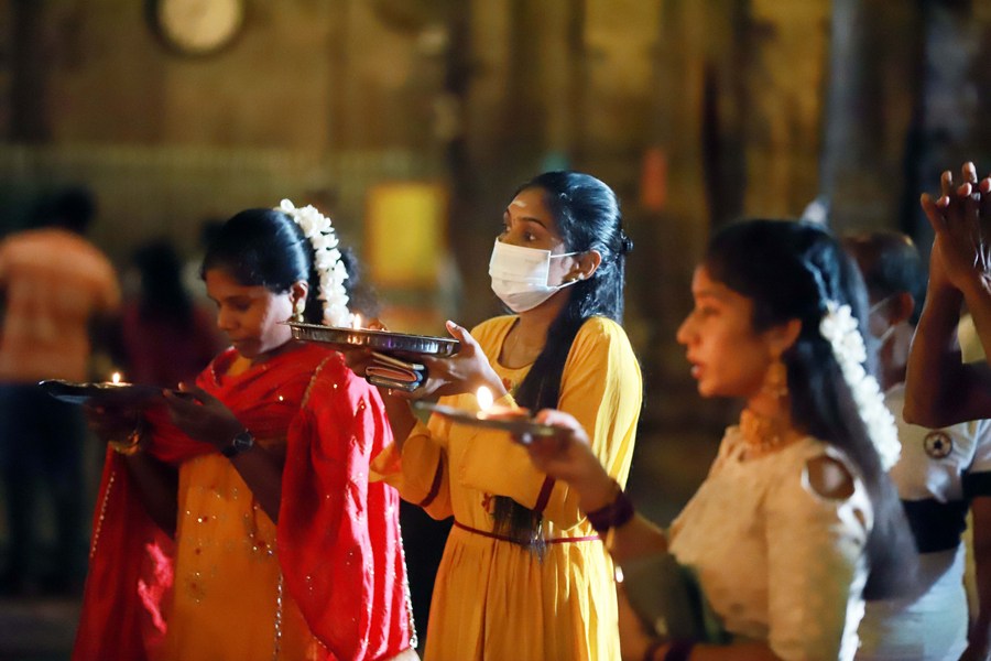 Hindu devotees celebrate Diwali, or the festival of lights, at a Hindu temple in Colombo, Sri Lanka, Oct. 24, 2022. (Photo by Ajith Perera/Xinhua) ■
