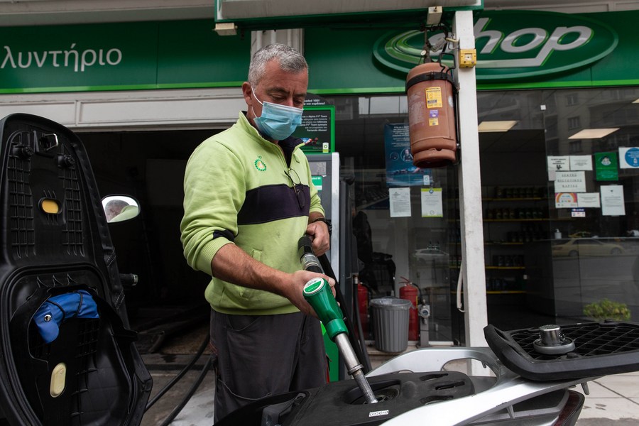 An employee of a gas station fills up a motorbike with gas in Athens, Greece, March 31, 2022. (Xinhua/Marios Lolos)
