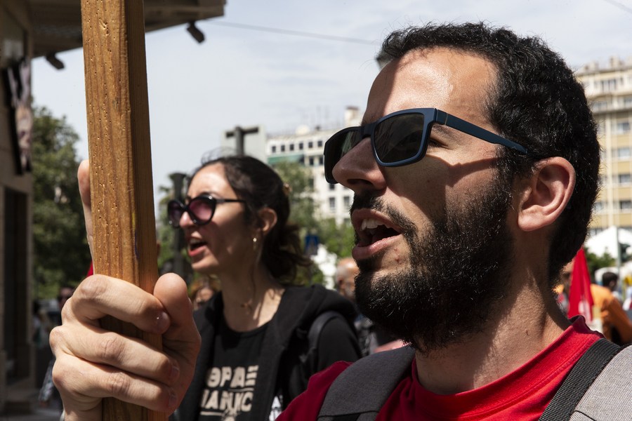 People take part in a demonstration on the International Labor Day in Athens, Greece, on May 1, 2022. (Xinhua/Marios Lolos)