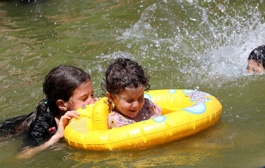 Children spend time in a spring during a heatwave near Jerusalem, on Aug. 22, 2022. (Photo by Gil Cohen Magen/Xinhua)