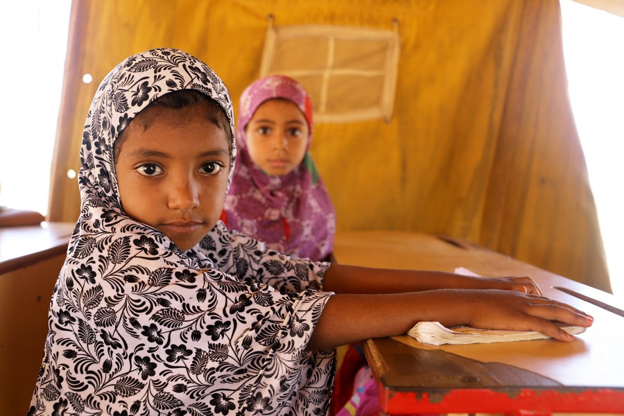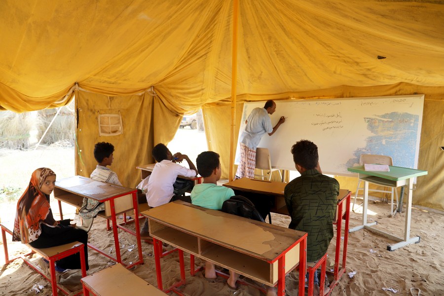 Students study inside a tent classroom in Hajjah province, northern Yemen, on Oct. 23, 2022. (Photo by Mohammed Al-Wafi/Xinhua)