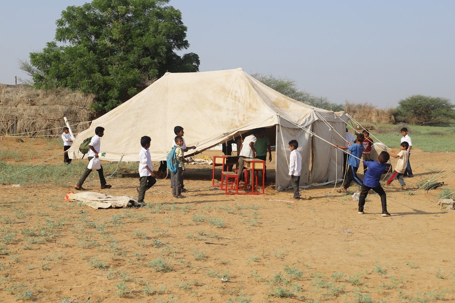 Students help to set up a tent that is used as a makeshift classroom after their school was destroyed in Hajjah province, northern Yemen, on Oct. 23, 2022. (Photo by Mohammed Al-Wafi/Xinhua)