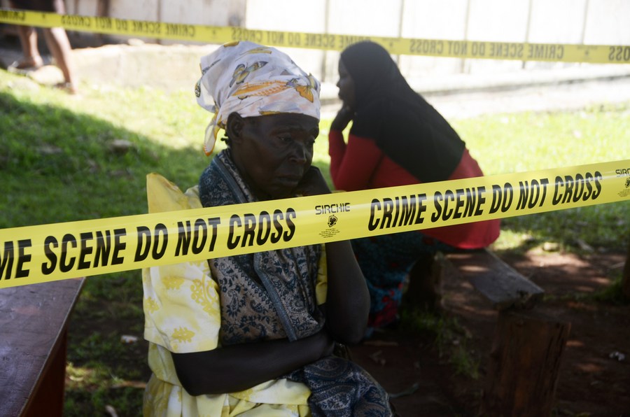 An elderly woman weeps at a cordoned off scene after a fire outbreak at Salama School of the Blind in Mukono, Uganda, Oct. 25, 2022. (Photo by Nicholas Kajoba/Xinhua)