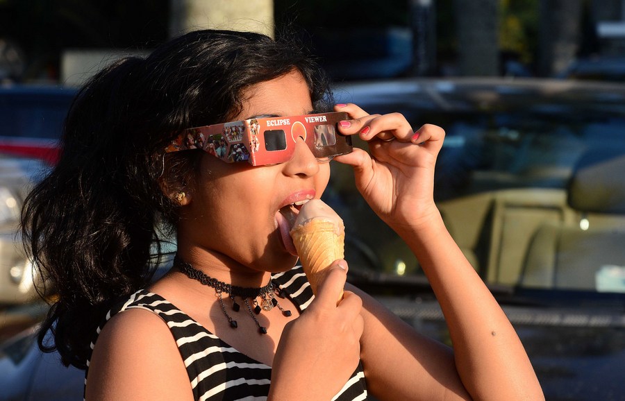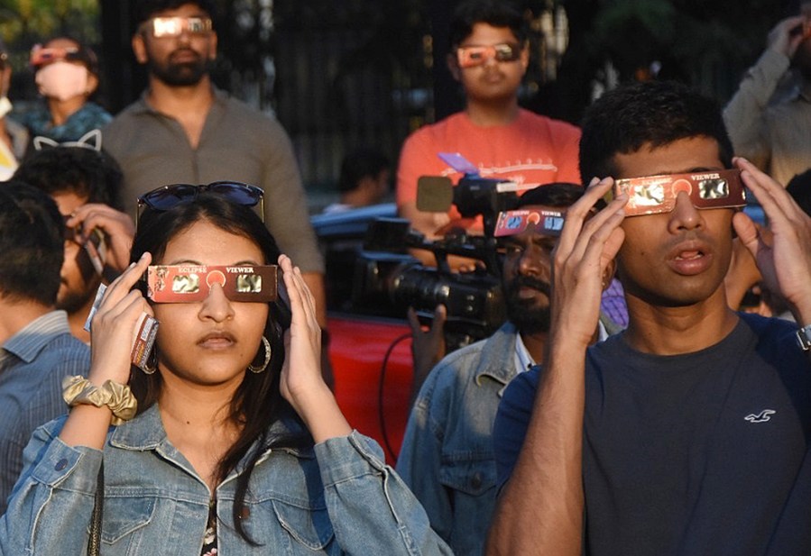 Indians were watching partial solar eclipse wearing protective glasses in Bangalore, India, Oct. 25, 2022. (Xinhua/Stringer)