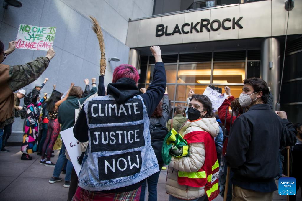 Climate activists take part in a protest in New York, the United States, on Oct. 29, 2022. Climate activists from multiple non-governmental organizations (NGOs) are implementing week-long protests against climate change and inequality ahead of the 10th anniversary of Hurricane Sandy. (Photo by Michael Nagle/Xinhua)