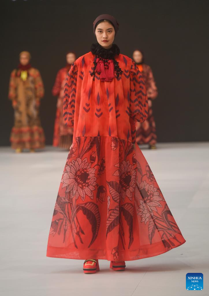 A model presents a creation by Indonesian fashion brand Kami during the Jakarta Fashion Week 2023 in Jakarta, Indonesia, Oct. 28, 2022. (Xinhua/Zulkarnain)