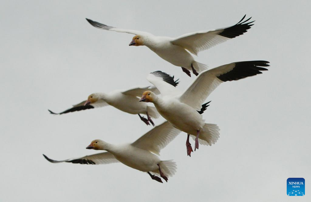 Snow geese fly over Garry Point Park in Richmond, British Columbia, Canada, on Oct. 27, 2022. (Photo by Liang Sen/Xinhua)