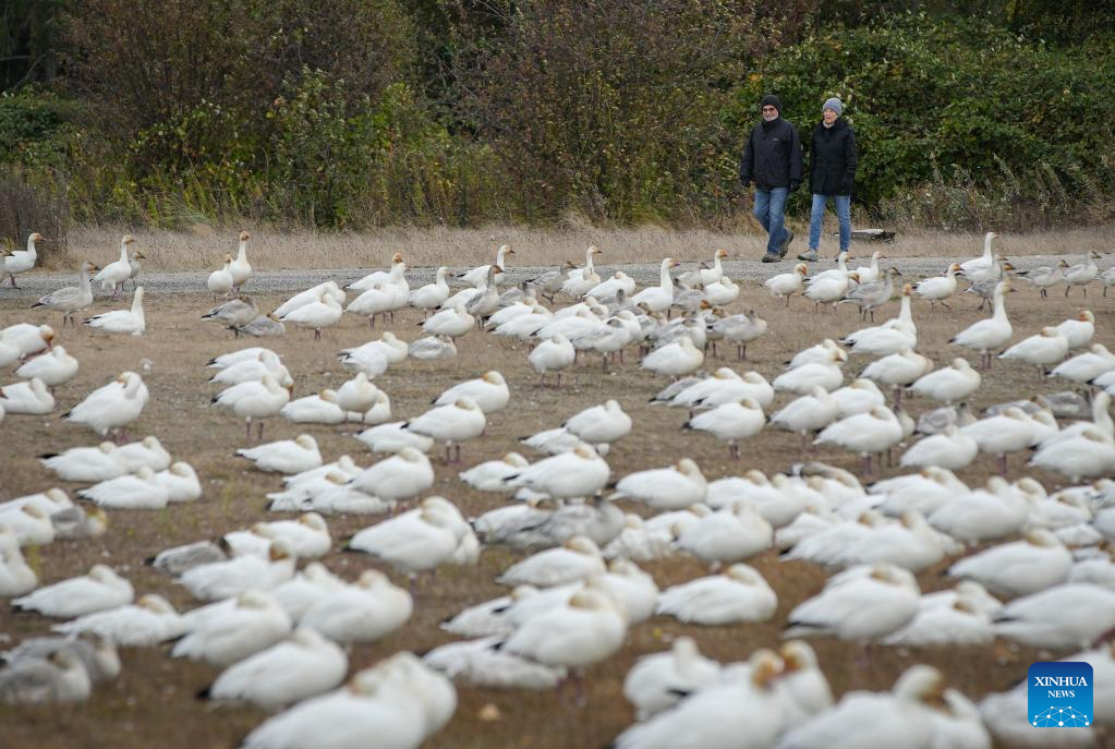 Snow geese are seen at Garry Point Park in Richmond, British Columbia, Canada, on Oct. 27, 2022. (Photo by Liang Sen/Xinhua)