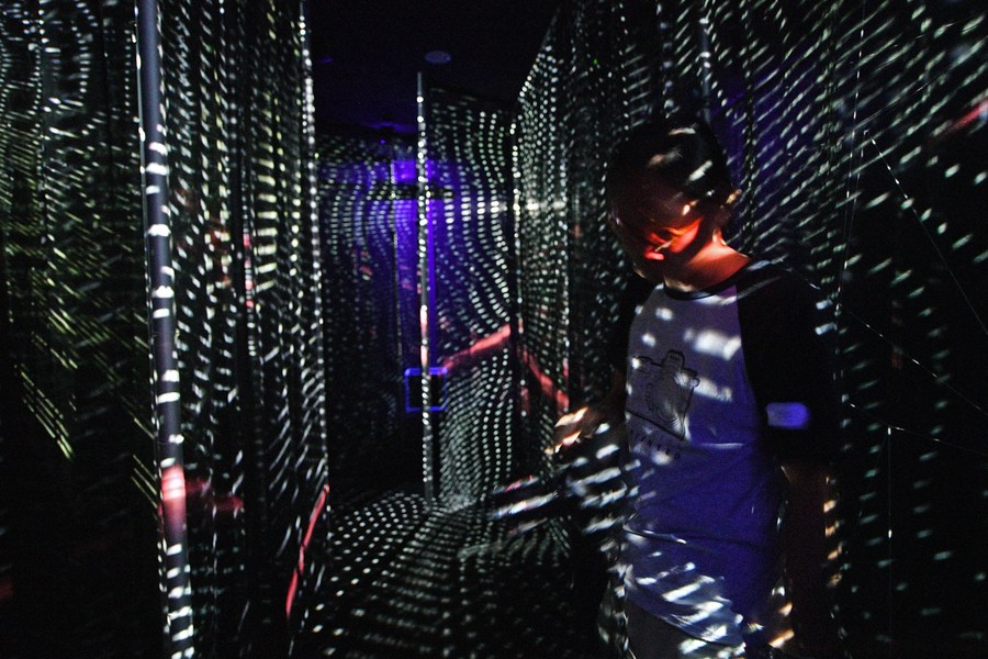 A visitor views the exhibits during the media preview of the mental-health-inspired "MENTAL: Colours of Wellbeing" exhibition held at Singapore's ArtScience Museum on Sept. 1, 2022. (Photo by Then Chih Wey/Xinhua)