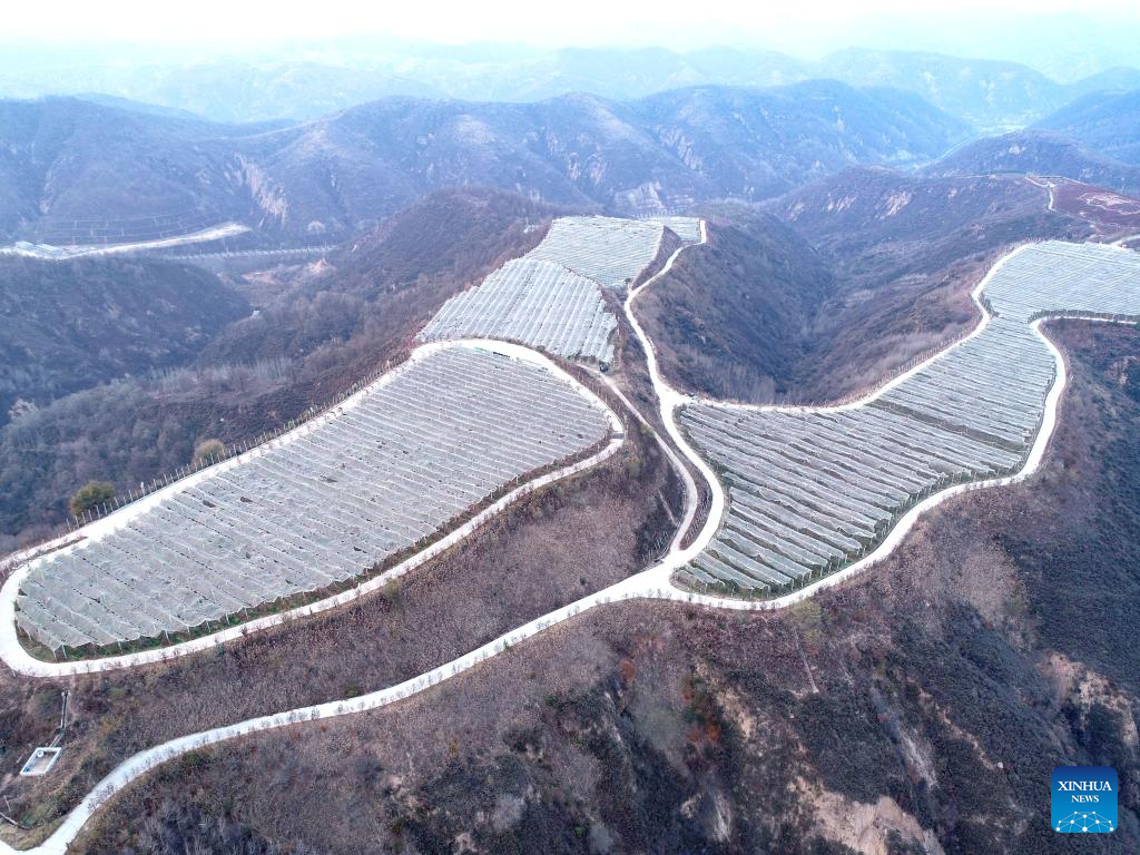 This aerial photo taken on Oct. 26, 2022 shows a view of an orchard in Nangou Village of Yan'an, northwest China's Shaanxi Province. Covering an area of 24 square kilometers, the Nangou Village is home to more than 1,000 villagers. Led by the village's Party branch, Nangou has worked out ways to inject vitality into the countryside. It has witnessed the boom of planting and breeding industries and rural tourism. Villagers have constantly increased their income by earning dividends and taking odd jobs during the slack farming season. (Xinhua/Zhang Bowen)