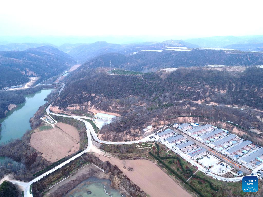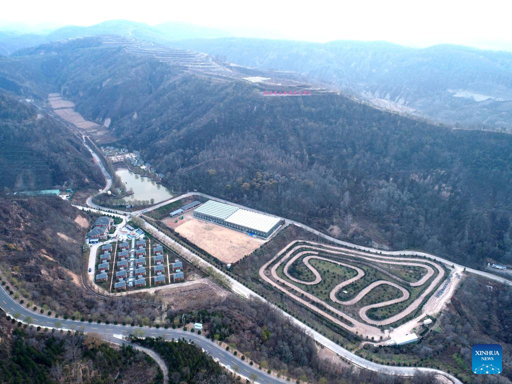 This aerial photo taken on Oct. 26, 2022 shows a view of a demonstration area for ecological agriculture in Nangou Village of Yan'an, northwest China's Shaanxi Province. Covering an area of 24 square kilometers, the Nangou Village is home to more than 1,000 villagers. Led by the village's Party branch, Nangou has worked out ways to inject vitality into the countryside. It has witnessed the boom of planting and breeding industries and rural tourism. Villagers have constantly increased their income by earning dividends and taking odd jobs during the slack farming season. (Xinhua/Zhang Bowen)