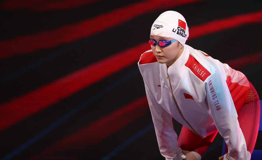 Li Bingjie of China reacts prior to the women's 800m freestyle final at the 19th FINA World Championships in Budapest, Hungary, June 24, 2022. (Xinhua/Li Ying)