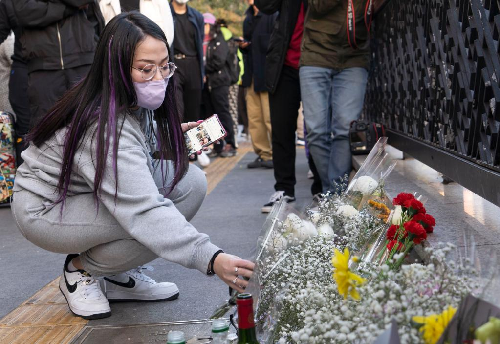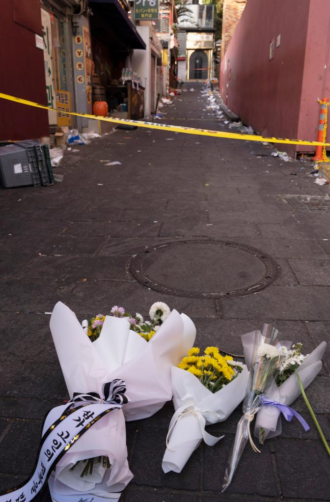 Flowers are laid for victims of a deadly stampede at Itaewon, a district in Seoul, South Korea, on Oct. 30, 2022.