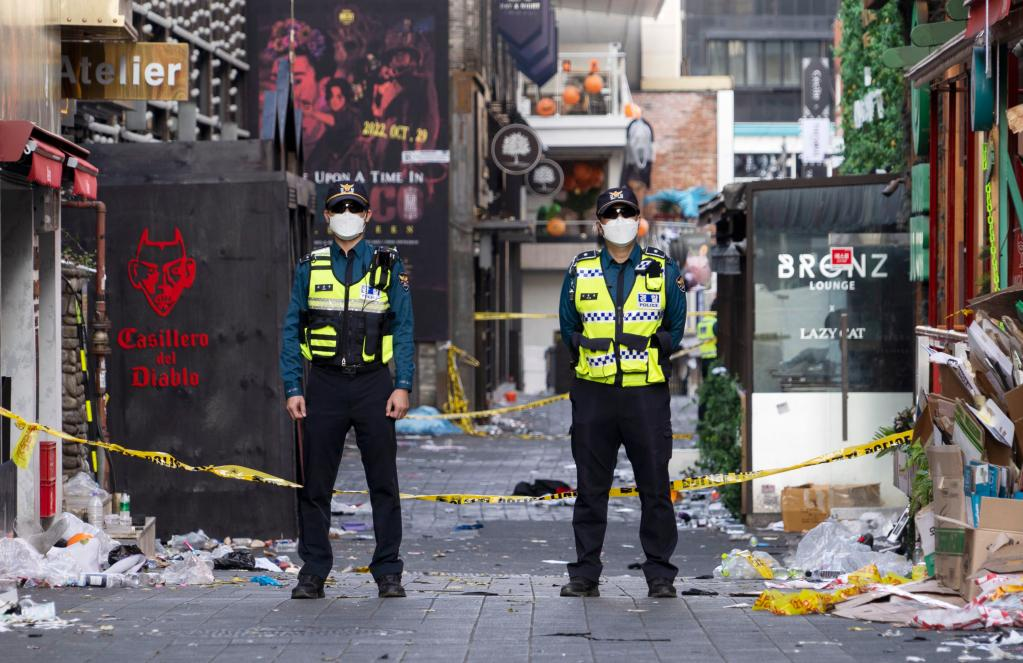 Police officers stand guard at the site of a deadly stampede at Itaewon, a district in Seoul, South Korea, on Oct. 30, 2022.