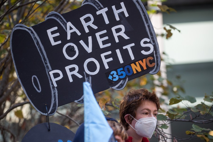 Climate activists take part in a protest in New York, the United States, on Oct. 29, 2022. (Photo by Michael Nagle/Xinhua)