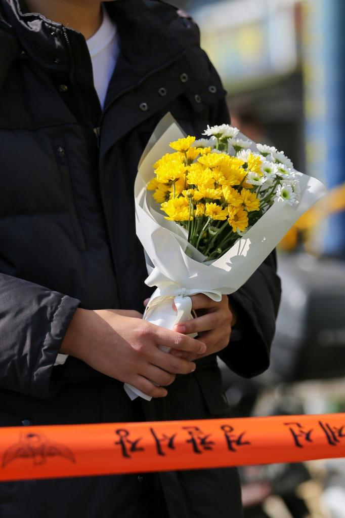 A man holding flowers is seen at the site of a stampede accident in Seoul, South Korea, Oct. 30, 2022. (Xinhua/Wang Yiliang)