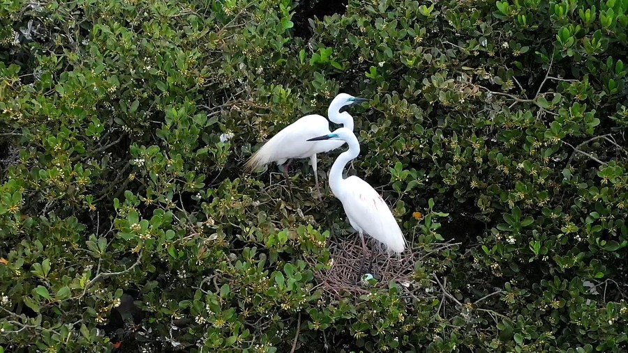 This aerial photo taken on Aug. 22, 2022 shows birds in Shankou Mangrove Nature Reserve in Hepu County of Beihai City, south China's Guangxi Zhuang Autonomous Region. (Xinhua/Zhang Ailin)