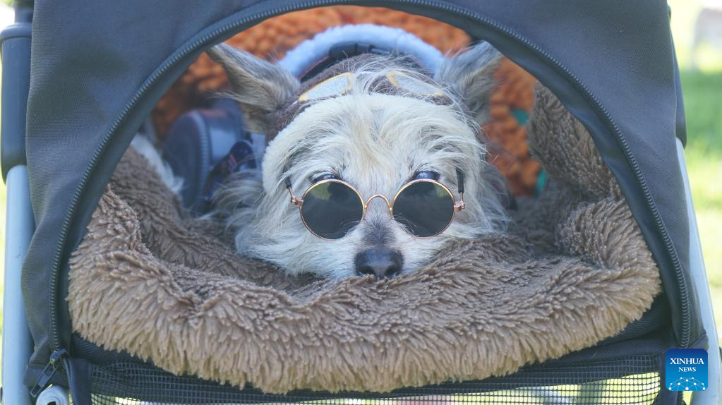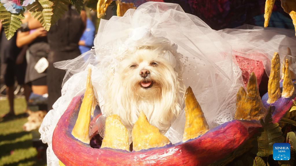 A dog dressed in a costume takes part in the 21st annual Haute Dog Howl'oween Parade at Marina Vista Park in Long Beach, California, the United States, Oct. 30, 2022. (Photo by Zeng Hui/Xinhua)
