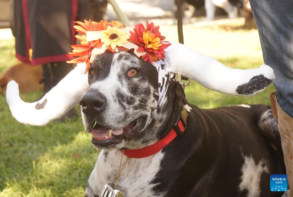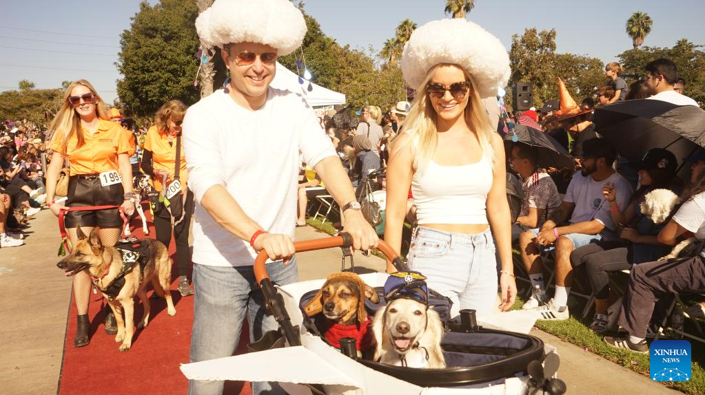 Dogs and their owners dressed in costumes take part in the 21st annual Haute Dog Howl'oween Parade at Marina Vista Park in Long Beach, California, the United States, Oct. 30, 2022. (Photo by Zeng Hui/Xinhua)
