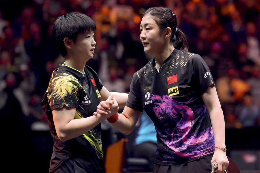 Sun Yingsha (L) and Chen Meng of China greet each other after their women's singles final match at the WTT Cup Finals. (Photo by Gao Zhiyong/Xinhua)