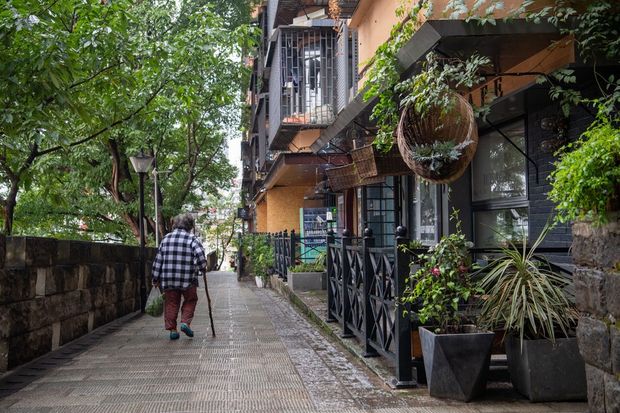 A resident walks through Daijiaxiang alley, dubbed "coffee street" after renovation, in Yuzhong District, southwest China's Chongqing, Sept. 24, 2022. (Xinhua/Tang Yi)