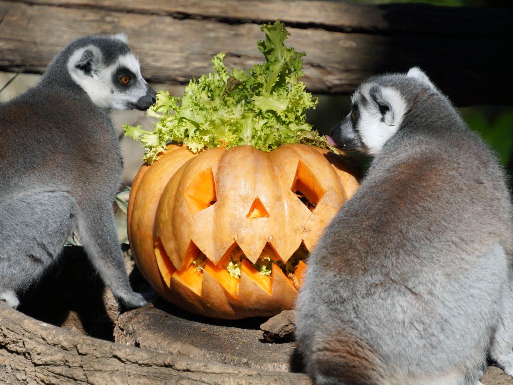 Ring-tailed lemurs look at a pumpkin at the Bioparco zoo in Rome, Italy, Oct. 30, 2022.
