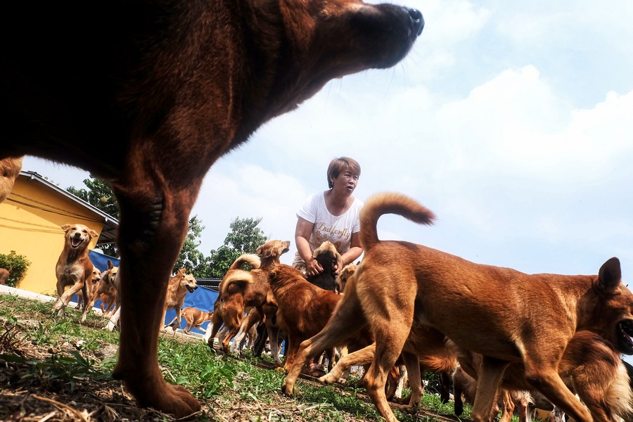A dog shelter owner plays with dogs outside cages during playtime at Serang, Banten Province, Indonesia on Nov. 1, 2022. (Photo by Agung Kuncahya B./Xinhua)