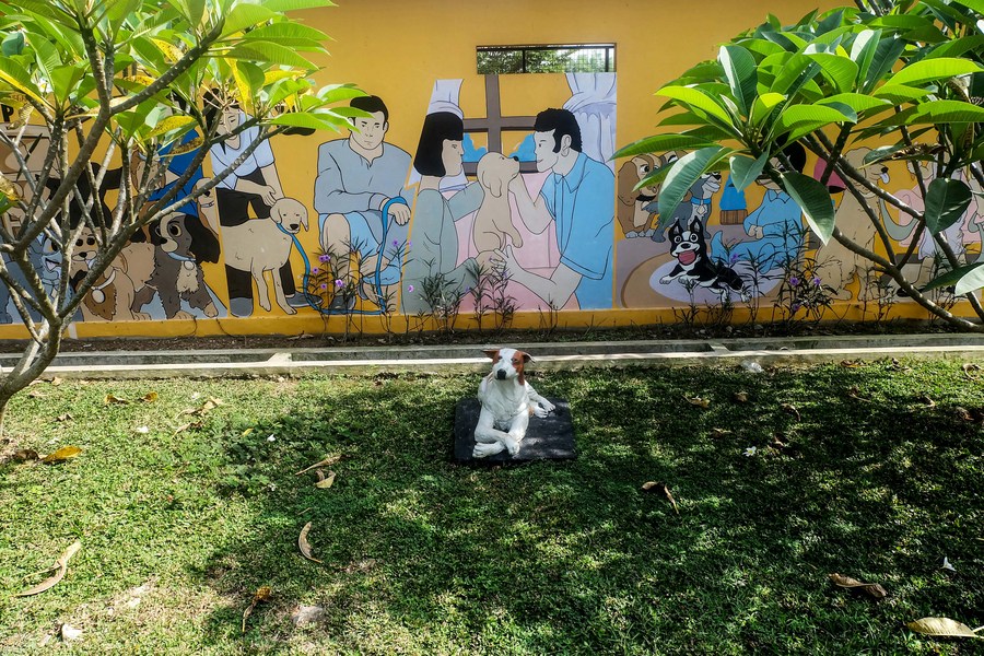 A dog statue is seen with a wall painting at Ting Ping Ping (TPP) Shelter House Foundation in Serang, Banten Province, Indonesia on Nov. 1, 2022. (Xinhua/Agung Kuncahya B.)