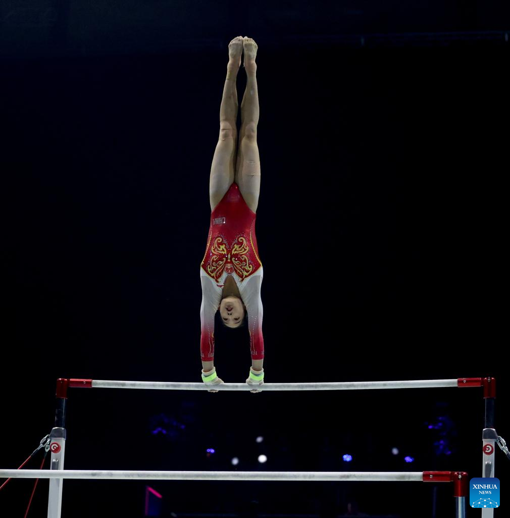 Tang Xijing of team China competes on the uneven bars of the women's team final at the 51st FIG Artistic Gymnastics World Championships in Liverpool, Britain, Nov. 1, 2022. (Xinhua/Li Ying)